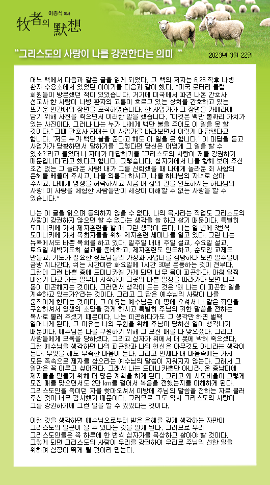 "그리스도의 사랑이 나를 강권한다는 의미"